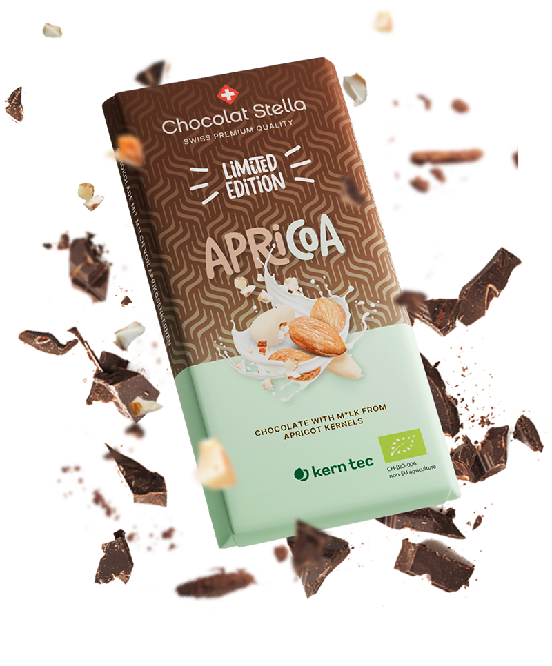 This unique bar combines smooth, melt-in-the-mouth chocolate with milk made from apricot kernels – enhanced by crunchy pieces of the same fruit seeds. Apricot kernels are an underutilized by-product of agriculture and have been carefully refined for this bar to be both resource-efficient and full of flavor. An innovative contribution to the circular economy and the reduction of food waste.