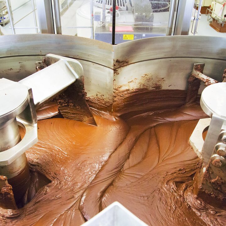 After grinding, the chocolate mass is still in its original state. The individual ingredients are not yet combined with each other in terms of taste. The chocolate mass is stirred and kneaded in conches until any unwanted acids have evaporated and a very fine, smooth melting mass is produced.