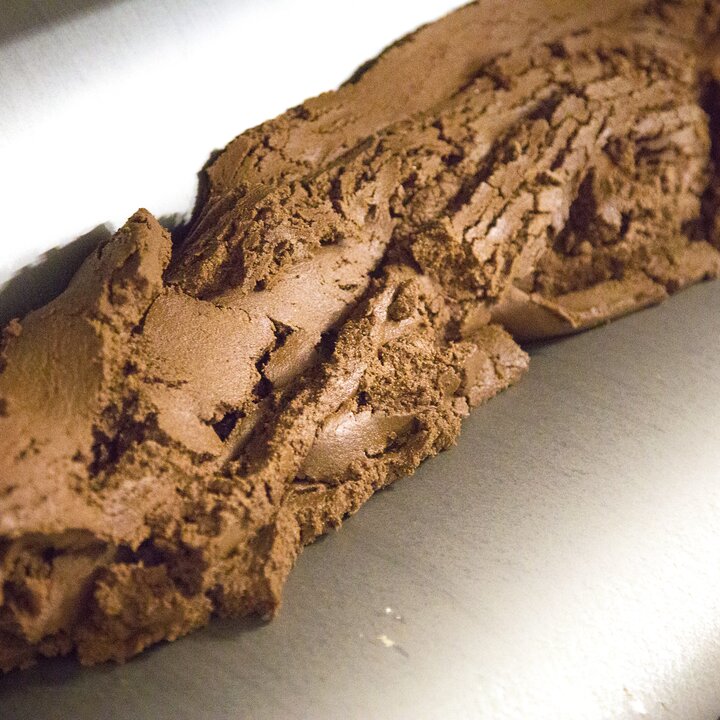 The ingredients are selected and weighed, and kneaded in the mixer until a homogeneous paste-like consistency is achieved. The mixture is coarse and sandy in texture and the flavour is not yet fully developed.